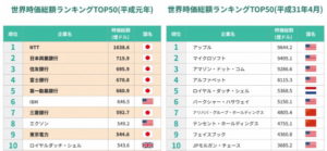 平成から令和への30年で、日本企業の集落ぶりがよくわかります。 ランク自体はあくまでほかとの比較なので、重要ではありません。 問題なのは、日本のとりのこされぶり。 約30年後には世界の成長にともなっていないということですね。