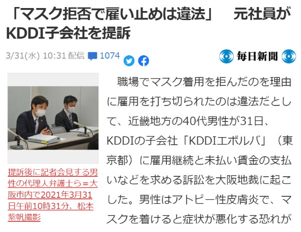 マスク拒否で解雇!雇い止めは違法として提訴へ ニュース 2021.04.01 マスクなんかで解雇とはなんとも、不景気かつ経済成長が見込めない日本らしい処分ですね。 「マスク拒否で雇い止めは違法」 元社員がKDDI子会社を提訴 Yahoo!ニュースYahoo!ニュースは、新聞・通信社が配信するニュースのほか、映像、雑誌や個人の書き手が執筆する記事など多種多様なニュースを掲載しています。 ただこれ主張とかわがままでなくて、アトピー性皮膚炎のため肌トラブルが重症化するというアレルギー持ちだそうで、いわば病人で医師の診断書も提出しています。 正確には解雇ではなく、契約社員の契約を延長しないということですね。 契約社員として採用された。大阪市内のコールセンターで勤務し、3~6カ月ごとに雇用契約を更新 でも日本は正社員にすると解雇が難しくなるので、正式には雇用せずに契約社員にするのが定番です。そしてこのように会社の都合でいつでも解雇できるようにしているんですね。 KDDIの子会社でコールセンター勤務。 コールセンターなら先にテレワーク環境を整えるのが会社としての義務でしょう。 でもふと考えてみると、提訴の内容通りにコロナで業績が悪化して人員を削減したかったのか、この人を気に入らなかったのか。そんな背景がありそうですけどね。 まぁコロナを理由に人員削減はどこでもある話でしょう。