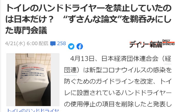 でも元情報の論文が間違っていたために、日本だけハンドドライヤーを禁止していたとは・・・