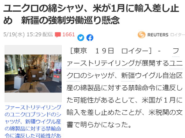 ユニクロ、アパレル業界で一人勝ちかと思いきや、世界の恥さらし企業に・・・ しかし根深いのは1月の制裁が日本では5月に報道されるという・・・ それだけ日本のマスコミが中共の支配下に置かれ、報道規制も行われている証拠でしょうね。 残っている日本人がどれだけ日本を守れるか。 そのくらいの話になってきました。 私もユニクロ愛用者です。 世界に恥じない企業としての選択をお願いしたいです。   ユニクロの綿シャツ、米が1月に輸入差し止め 新疆の強制労働巡り懸念