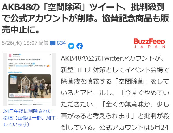 AKB48の「空間除菌」ツイート、批判殺到で公式アカウントが削除。協賛記念商品も販売中止に。