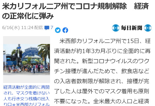 「全米最大の人口と経済規模を誇る同州での再開は、米国経済の正常化に向けた弾みとなりそうだ」 いや違う。多数の州は相当前からオープンなので、”足を引っ張っていた州がやっと正常化した”が正しい。 そもそも解除ではなく緩和に過ぎずまだ足かせはたくさん残っている。