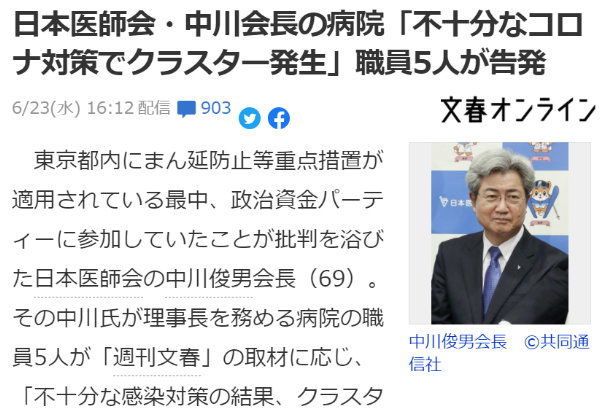 日本医師会・中川会長の病院「不十分なコロナ対策でクラスター発生」職員5人が告発ちゃんとした医療者ならインフルやノロでも部屋くらい分けます。 史上最悪の感染症と言うてるヤツが陽性者と相部屋にするとか、一番ナメた対策をとってたという。 こんなふざけた姿勢の医療者が、我が物顔でモノ言うて、世の中を掻き乱してる訳なのです。https://t.co/vIRqJmzEzd