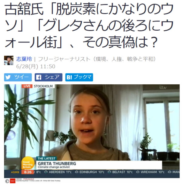 古舘氏は地球温暖化対策に関連して「脱炭素と言っている綺麗ごとはかなりのウソがあると思う。脱炭素というのはビジネスになるから」「(環境活動家の)グレタ・トゥンベリさんの後ろにも何百社と金融関係、ウォール街がついている」と発言。グレタさん「気候変動は存在しない」と改心?