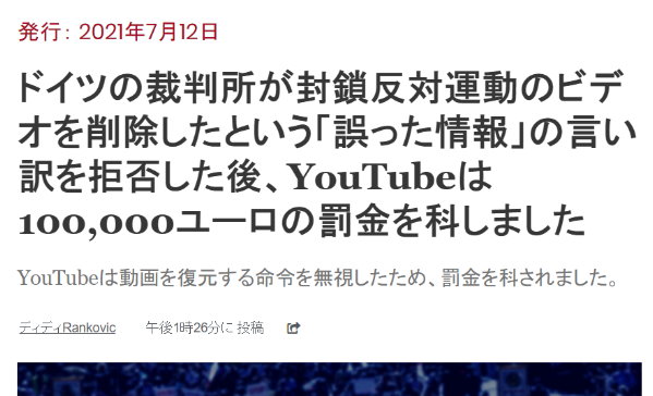 ドレスデン高等地方裁判所は「スイスで撮影されたロックダウン抗議デモの動画をYouTubeが削除したのは違法」との判決を下し、動画の復元を言い渡しました。しかしYouTubeはこれを無視。裁判所は「意図的かつ重大な違反」として罰金10万ユーロを通告。判決を無視とか反社ですね YouTube fined 100,000 Euro after German court rejects its "misinformation" excuse for deleting anti-lockdown protest videoYouTube ignored an order to reinstate the video and so was fined.