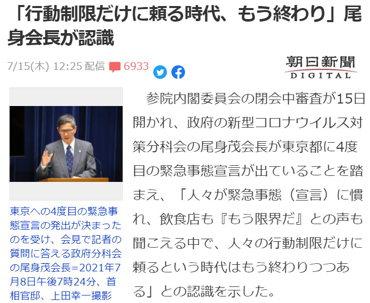 政府の新型コロナウイルス対策分科会の尾身茂会長が東京都に4度目の緊急事態宣言が出ていることを踏まえ、「人々が緊急事態(宣言)に慣れ、飲食店も『もう限界だ』との声も聞こえる中で、人々の行動制限だけに頼るという時代はもう終わりつつある」との認識を示した。 尾身氏は新型コロナの感染防止について、PCR検査の拡充や二酸化炭素モニターの設置、下水でウイルスを高濃度で検出する技術などを例に挙げて「日本には優れた科学技術がある」と説明。周回遅れのコロナ対策しか発想できない分科会。 ここにきてPCR検査の拡充や二酸化炭素モニターなど、的外れな思いつきを発言する始末。 今までの労はねぎらい、もう日本のためにお引き取り願いたい。