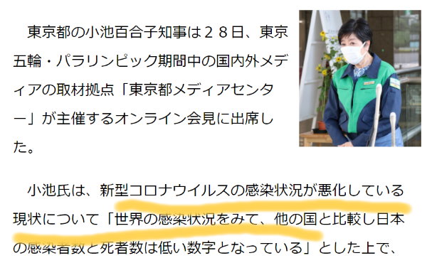 小池百合子都知事、新規感染者が過去最多更新も「第3波時とは状況が異なる」小池 「世界の感染状況をみて、他の国と比較し日本の感染者数と死者数は低い数字となっている」 ワロタwwhttps://t.co/Qb6eJeUBMb