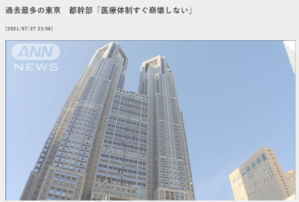 過去最多の東京 都幹部「医療体制すぐ崩壊しない」