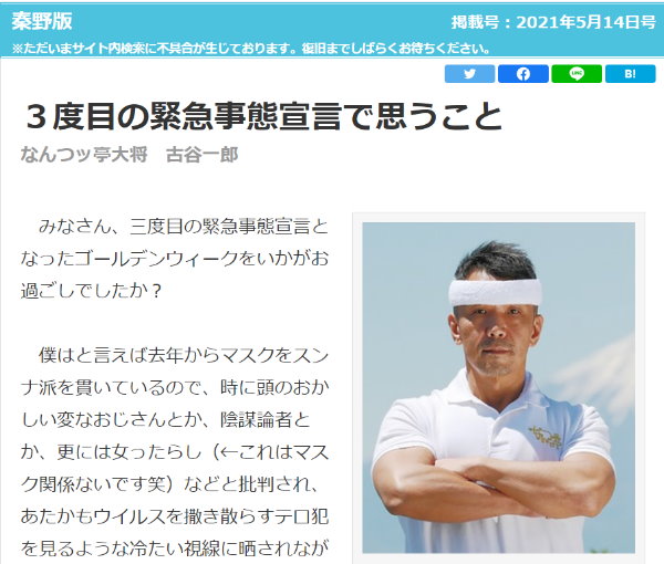 3度目の緊急事態宣言で思うこと なんつッ亭大将 古谷一郎 | 秦野 | タウンニュース