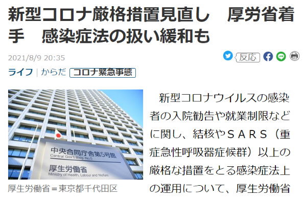 新型コロナ厳格措置見直し 厚労省着手 感染症法の扱い緩和も