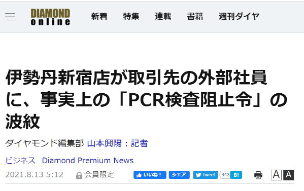 伊勢丹新宿店が取引先の外部社員に、事実上の「PCR検査阻止令」の波紋