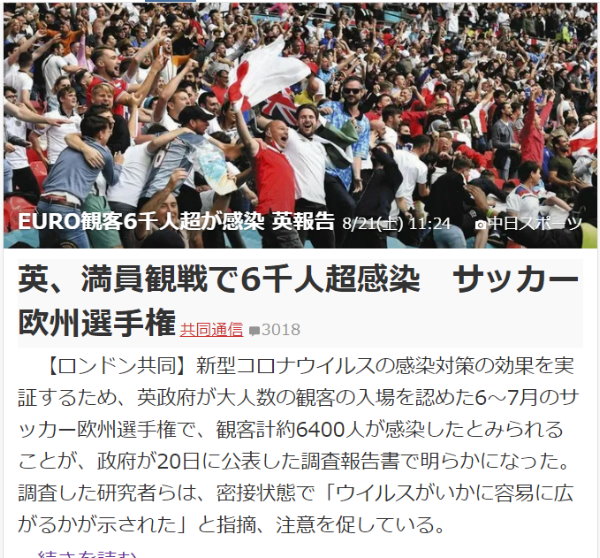 ワクチン接種済み確認の観客だけ、でした。 ワクチンには感染予防効果は期待できないことが実証されましたね。 英、満員観戦で6千人超感染 サッカー欧州選手権 | 2021/8/21 – 共同通信