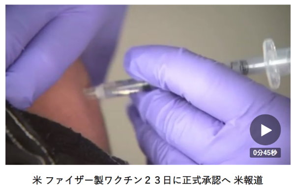 FDA(アメリカ食品医薬品局)は今月上旬「ワクチンを正式承認する際に、公開審理のプロセスを踏まない」と堂々宣言していましたが今日、連邦政府高官は近々ファイザー社製ワクチンが正式承認されるだろうと発言。週明けにも、と見込まれています。日本政府の動向に要注意です。