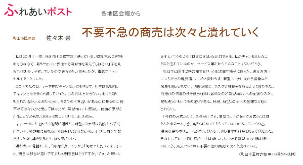 町田市医師会 佐々木 崇 不要不急の商売は次々と潰れていく 私は2カ月に一度、行き付けの理容院に通っている。理容行為は3密そのものなので、新型コロナに感染する可能性を考えてしばらく様子を見ることにした。 予約していたので後ろめたい気もしたが、電話でキャンセルすることにした。 コロナのためという一方的なキャンセルにも拘らず、店主は気を回してキャンセルを快く承諾してくれた。心の内は分からない。他にも断りを入れた客がいるのだろうか。今までの付き合いがあるのに断るのは理不尽ではないかと思ってはみたが、新型コロナに感染し、自由が束縛されることなどを思い巡らすと致し方ないと心に決めた。 キャンセルした日から2週間が過ぎた。新型コロナ禍は相変わらず続いている。後頭部に触れると何時もより幾分髪が多いようだ。自分で髪を洗った後、鏡を見るとさっぱり感がない。 満を持して電話をした。「何時が良いですか」「何時でも良いです。あっと、明日は都合が悪いです」「じゃ明後日はどうですか」「じゃ、お願いします」いつものようにはきはきとした応対である。私がキャンセルしたことなど忘れているのか、サービス業だからそんなことはないだろう。 私は手術用手袋を装着するという重装備で椅子に座った。彼女の方はマスクだけの軽装備。いつもと変わらず、新型コロナに向かう姿勢など微塵も感じられない。洗髪の際は、マスクや補聴器を取るように言われた。前掛けの襟首の所を幾分強めに絞めたのが新型コロナへの配慮なのか。髪を洗うのもいつもの通りである。特段、新型コロナへの配慮など感じられない。 「今日のお客さんは、先生だけです。新型コロナが怖くてお客さんはほとんど来ません、皆、奥さんにやってもらっているのかな。テレビの出演者の髪のボリュームが増えている」。少し高めの料金を払って店を出た。それにしても、一日に客が一人は厳しい。いつまで新型コロナ禍は続くのだろう。素人でもできる不要不急の商売は次々と潰れていく。 (町田市医師会報 第553号から抜粋