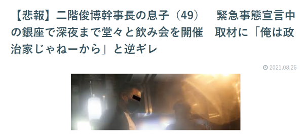 【悲報】二階俊博幹事長の息子(49) 緊急事態宣言中の銀座で深夜まで堂々と飲み会を開催 取材に「俺は政治家じゃねーから」と逆ギレ【悲報】二階俊博幹事長の息子(49) 緊急事態宣言中の銀座で深夜まで堂々と飲み会を開催 取材に「俺は政治家じゃねーから」と逆ギレ https://t.co/2I7oxr4Tqo
