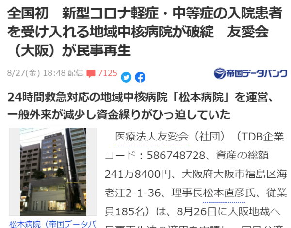 2020年12月には当病院で、病棟看護職員をはじめ入院患者、病棟職員が新型コロナウイルスに感染していることが判明。外来患者数が大きく落ち込むなか、2021年1月からは緊急事態宣言下における新型コロナウイルス患者受け入れ病床不足の解消に向けて大阪府から強い要請を受け、一部の病床を軽症・中等症対応としていたものの、これにより外来患者数は一層落ち込み、さらに人件費など経費負担が増加したことで資金繰りがひっ迫。もっとも、さっさと5類にすれば解決するでしょうが、現状の利権を持っている連中は猛反発するでしょうね。 たとえばPCR検査で儲けていれば、5類になったら病院の検査費用も有料です。 今は無料でバンバンできるので、笑いがとまらないですが適正化されたら大損です。 マスクなんかでは感選手対策になんてなりません。 インフルエンザと同じく、コロナはただの風邪。 国民がこの事実に気がつくだけでも、社会は正常化するということですね。