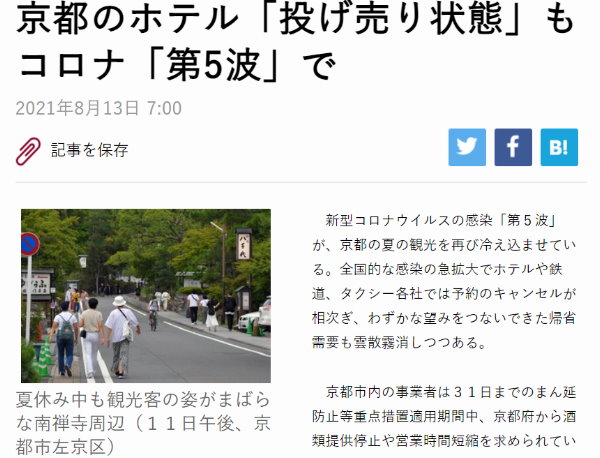 京都のホテル「投げ売り状態」も コロナ「第5波」で