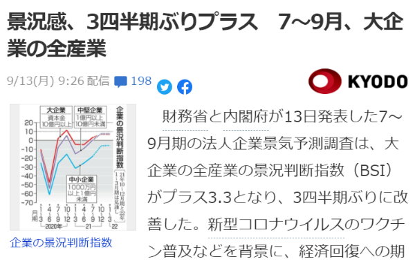 財務省と内閣府が13日発表した7~9月期の法人企業景気予測調査は、大企業の全産業の景況判断指数(BSI)がプラス3.3となり、3四半期ぶりに改善した。