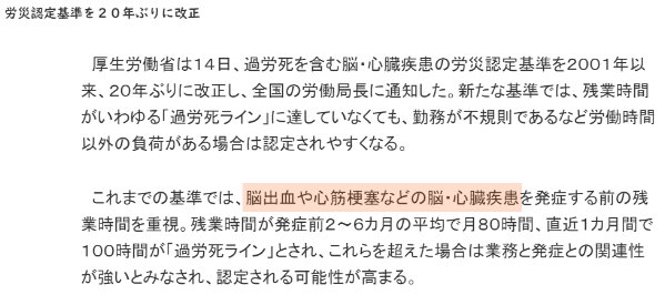 これまでの基準では、脳出血や心筋梗塞などの脳・心臓疾患を発症する前の残業時間を重視。残業時間が発症前2~6カ月の平均で月80時間、直近1カ月間で100時間が「過労死ライン」とされ、これらを超えた場合は業務と発症との関連性が強いとみなされ、認定される可能性が高まる。