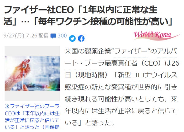 ファイザー社CEO「1年以内に正常な生活」…「毎年ワクチン接種の可能性が高い」ファイザーCEO: 「世界的に出現する変異に対処するために、新型コロナに対して毎年予防接種をする必要があると考える」(モデルナのCEOと同じこと言うとる) https://t.co/69PS2HQna8