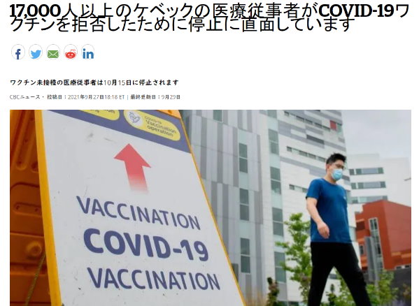 17,000人以上のケベックの医療従事者がCOVID-19ワクチンを拒否したために停止に直面しています🇨🇦 ケベック州の17,000人以上の医療従事者が接種を拒否。来月から停職処分を受けるため、州当局はその穴埋めに奔走。https://t.co/lpF7DILSlC