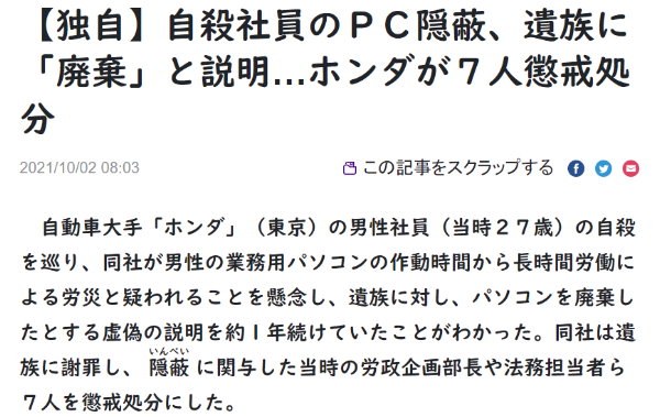 【独自】自殺社員のPC隠蔽、遺族に「廃棄」と説明…ホンダが7人懲戒処分