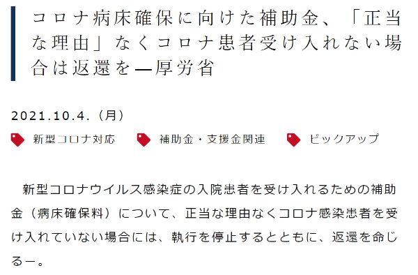 厚労省は10月1日「正当な理由なく患者を受け入れなかった場合は病床確保料の返還」と通知。インスタで「空床の補助金は返還する」と表明した尾身は自らJCHOが正当な理由なく患者を受け入れず不正受給した事実を認めたのだから真っ先に返還すべきだし分科会会長も辞任すべきだ