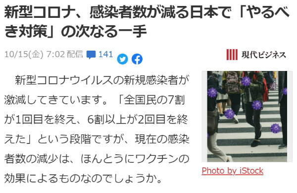新型コロナ、感染者数が減る日本で「やるべき対策」の次なる一手(現代ビジネス) https://t.co/mvx7qImoeo — RABW (@agstbrwsh) October 14, 2021