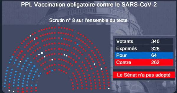 フランス上院が圧倒的多数でワク義務を拒否。 反対は262票、賛成は64票。