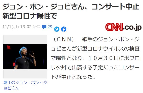 接種済のボン・ジョヴィが コロナに感染。接種証明を求めてた公演を中止ってなんとアホなニュース。 接種証明が意味ないって さすがにファンも気づいたか? CNNもツッコめよ。