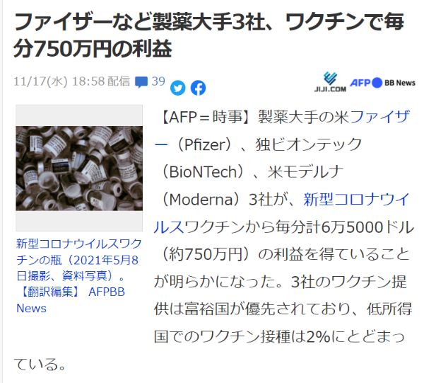 感染予防効果もなく、発症、重症化、死亡も防がない。 費用は国が負担してくれ、免責で副反応も因果関係不明で却下。 まさにコロナワクチンに騙されてくれる人のおかげで、メシウマ案件というわけですね。 たぶん接種を勧める医師も、なんらかの恩恵があるからこそ情弱を騙して接種させることでしょう。美味しすぎるビジネスですから。 庶民の対応策としては、コロナが怖いなんてデマに騙されないことでしょうね。 ファイザーなど製薬大手3社、ワクチンで毎分750万円の利益