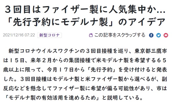 【読売新聞】 新型コロナウイルスワクチンの3回目接種を巡り、東京都三鷹市は15日、来年2月からの集団接種で米モデルナ製を希望する65歳以上に限って、今月17日から「先行予約」を受け付けると発表した。3回目接種はモデルナ製と米ファイザ