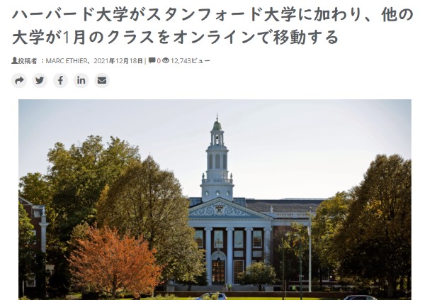 またもやワクチン政策が失敗へ。 対面授業のためにコロナワクチンの完全接種を義務化したハーバード大学。 オミクロンになんら効果なくリモート授業へ逆戻り。 恐怖や不安で人を煽り、デマのワクチンを接種させる。 条件としていた約束も守らずに、人口削減は勧める。 何も考えない代償は、とてつもなく大きい。 大学生には、政府やマスコミのウソに騙されて命を粗末にしないで欲しい。
