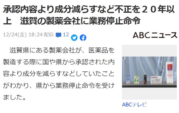 承認内容より成分減らすなど不正を20年以上 滋賀の製薬会社に業務停止命令滋賀県の製薬会社「日新製薬」が、20年以上医薬品の成分量を承認された量から勝手に減らして製造・販売