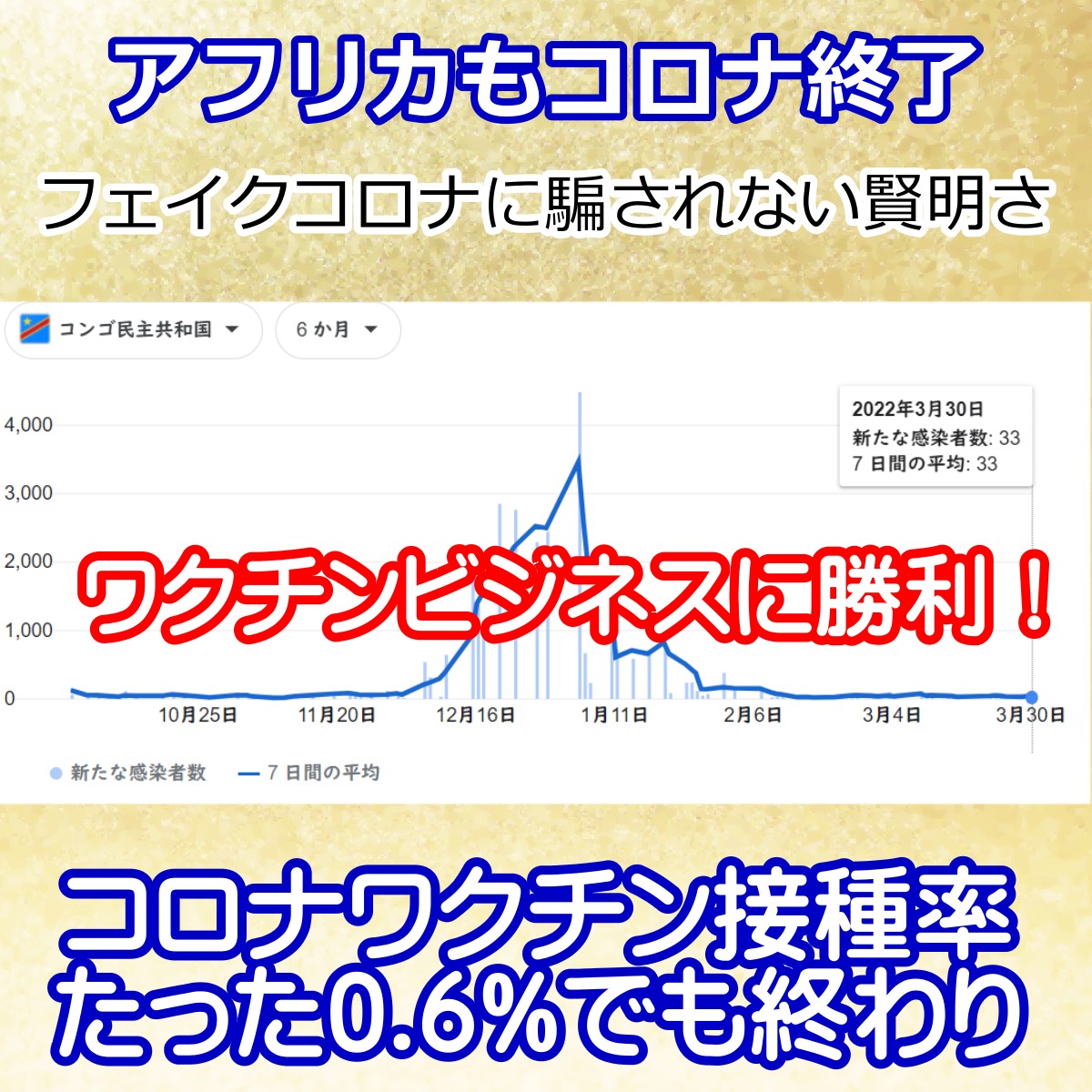 2022年の2月には、WHOもアフリカでのコロナ終息を示唆。 なんとコンゴでは0.6%の接種率でもコロナ終息! 副反応、ワクチン後遺症のリスクもなく終わり。 反面、接種を進める国では・・・ まぁアフリカではワクチンビジネスの被害にあった歴史があるので、ワクチンの正体を知る人が多いのでしょうね。 じじつ、感染がどうのとか変異株がどうのとか、どーでもよかった。 現実がすべてですから。 これからワクチン後遺症で大混乱が起きる日本。 薬害訴訟というだけでなく、社会インフラにも大きな影響を与えそうですね。「アフリカはパンデミック終了段階になっている」とWHO幹部が発言。 アフリカの2回接種率は11%程度。 ワクなしでも終わるということをアフリカが証明しつつある。