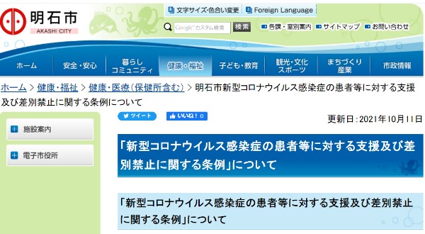 「新型コロナウイルス感染症の患者等に対する支援及び差別禁止に関する条例」について明石市は『コロナ差別禁止条例』を制定し、 「感染者」への差別を禁止するとともに、 条例を改正して「ワクチン未接種者」への差別も禁止した。 あわせて、障害者や高齢者などが接種する際の 「特段の配慮」規定も盛り込んだ。 ポイントは「全員一律」ではなく、 「一人ひとり丁寧に」ということだ。 pic.twitter.com/BEpp4lLwec
