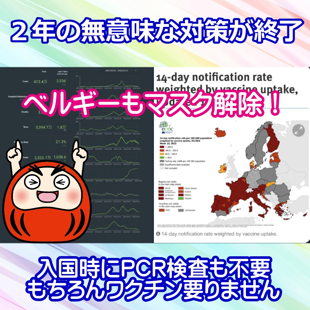 5月23日より、EU外からの必要不可欠ではない渡航の禁止は、解除されます🥳 また、1日目及び7日目の検査義務、10日間の検疫も不要になります✈️ また、公共交通機関でのマスク着用義務も解除されます😷 ベルギーに行くぞ〜😘 pic.twitter.com/ia8KtSBEDv — Union Clip(海外情報メディア) (@UnionClip) May 22, 2022