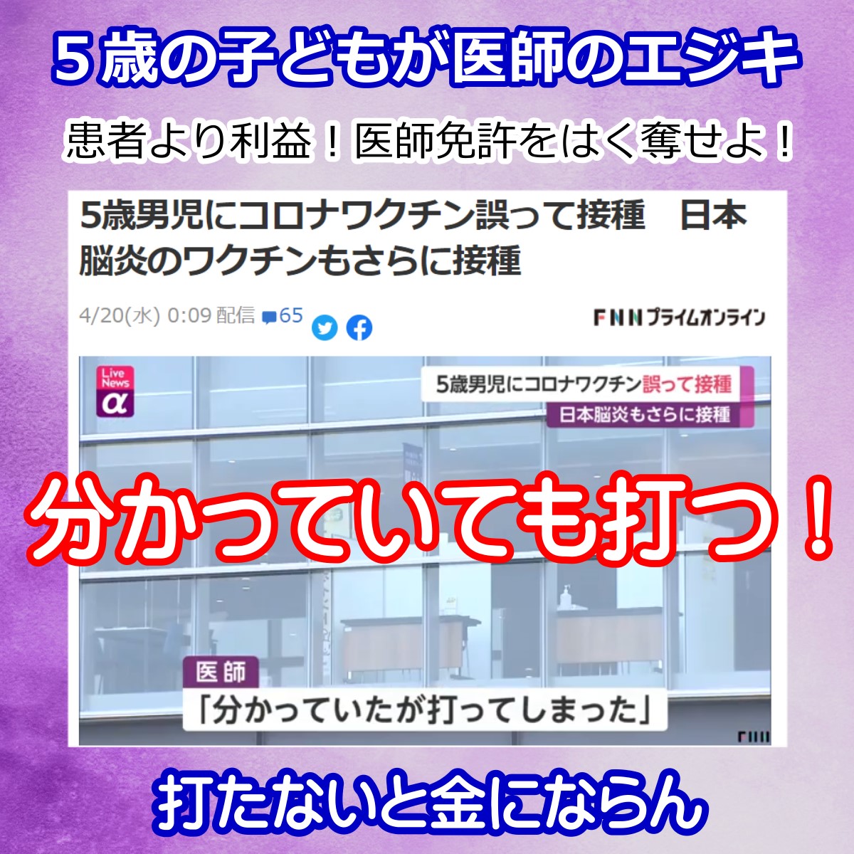 これは親でも防ぐのは難しいので、医療にかかわらないで済む健康な生活を実践するしかないですね。 医師の殺人未遂はどうでもいい。 坊やがどうぞご無事でありますように!!!5歳男児にコロナワクチン誤って接種 日本脳炎のワクチンもさらに接種