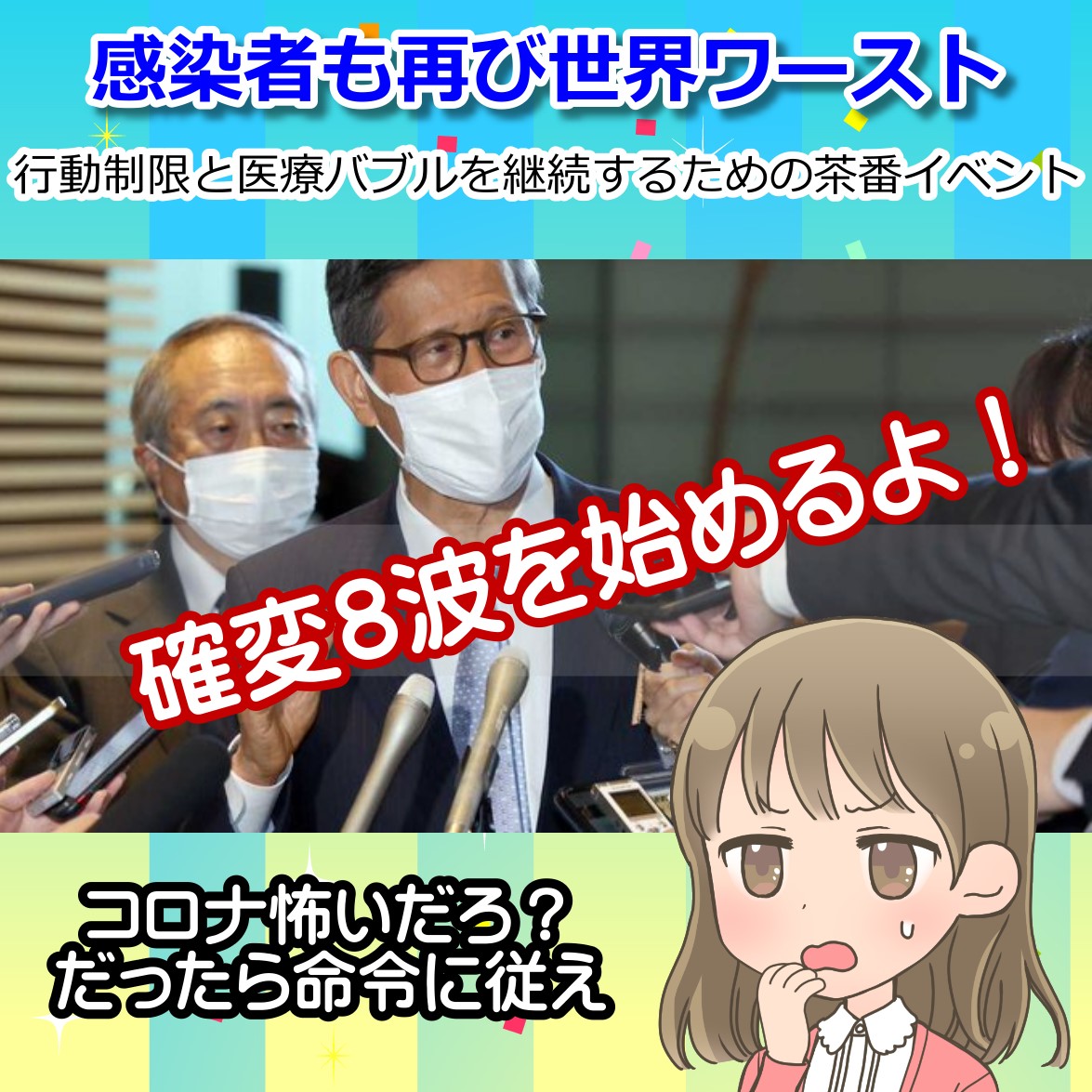 自殺者が8千人増え、出生数が24万人減り、総額300兆円を浪費するぐらい、日本人が感染対策を頑張って、ワクチンを打ちまくって、いつでもどこでもマスクを着用した結果、またまた感染者数が世界一になりましたとさ。