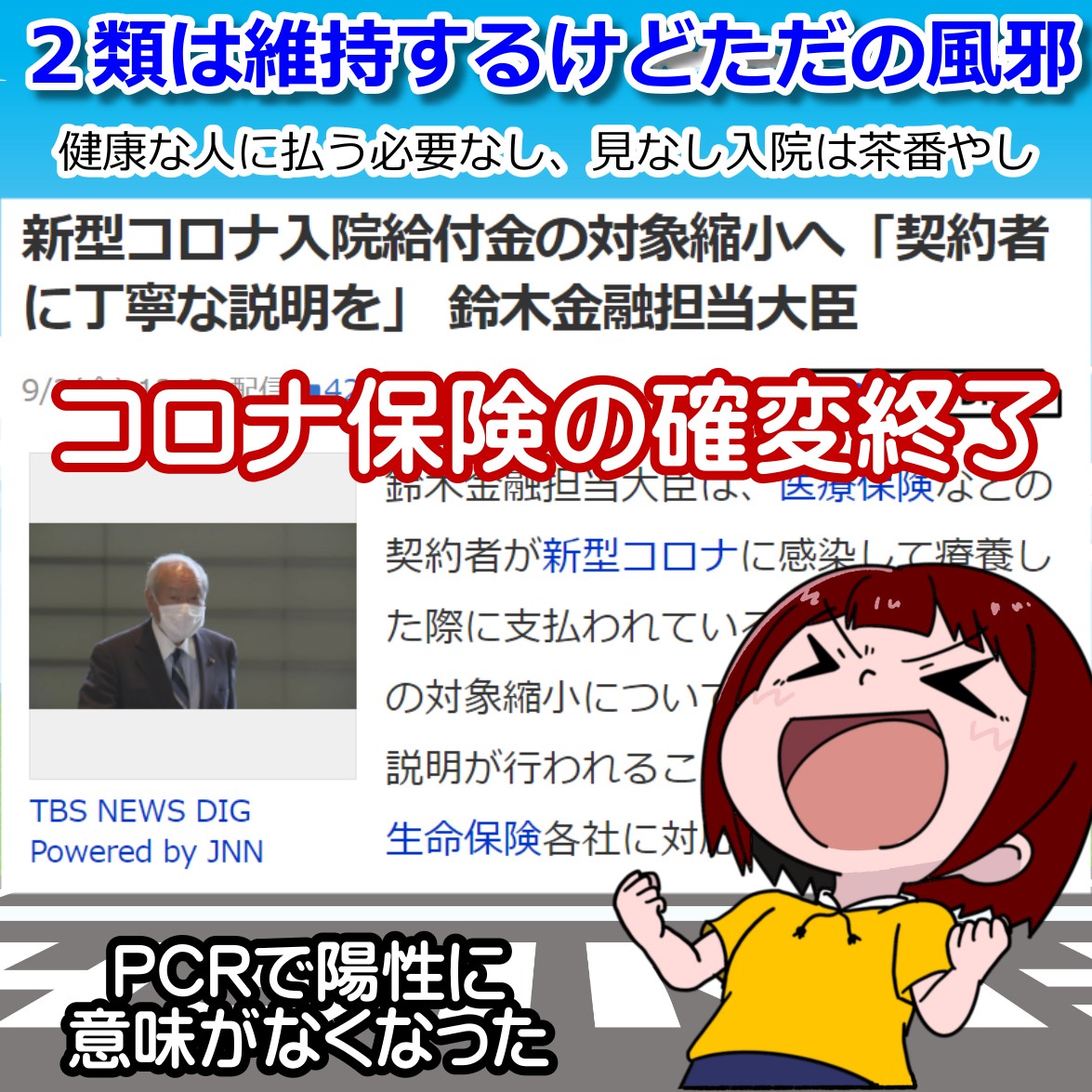不正の温床であったコロナ保険。 9月いっぱいで、支払い条件を大幅に変更。 マジメな加入者は気の毒ですが、もうただの風邪、 指定感染症にしている政府の責任でしょうね。 当初は本当に危険なウイルスだと扱ってきたものの、現在では普通の風邪と明らかなコロナ。 普通の風邪ですから、PCR検査などの「陽性」程度で「感染者」扱いしていたらキリがありません。 元気で健康な人間が「みなし陽性」で自宅療養ならば、もう支払いませんよと。 もっともマジメな加入者としては、不満がでるのも当たり前ですよね。 ただ保険会社としては、なんのリスクもない「陽性者」を病人扱いにしてはビジネスが破綻します。本当にリスクのある人を対象にするのは当然でしょう。 政府がすぐやるべきことは、さっさと5類以下の適正な扱いにすること。 そもそも2類以上の指定感染症扱いなのですから、「感染者」は入院が原則。 その前提は危険なウイルスだったから。 エボラでも致死率50%程度。 こんなコロナのように99%が健康な人を「2類以上の感染者」としているからおかしいのです。10月、陽性者数は激減します。一つは「波」の問題。もう一つは9月下旬で「みなし入院(自宅療養)」への保険金がおりなくなるからです。もしかしたら、9月中に「かけこみ無料PCR検査行列」が出てなんとしても陽性になろうと頑張る勇者が続出し、大幅に下がらないかもしれません。最後のチャンスだぞ!