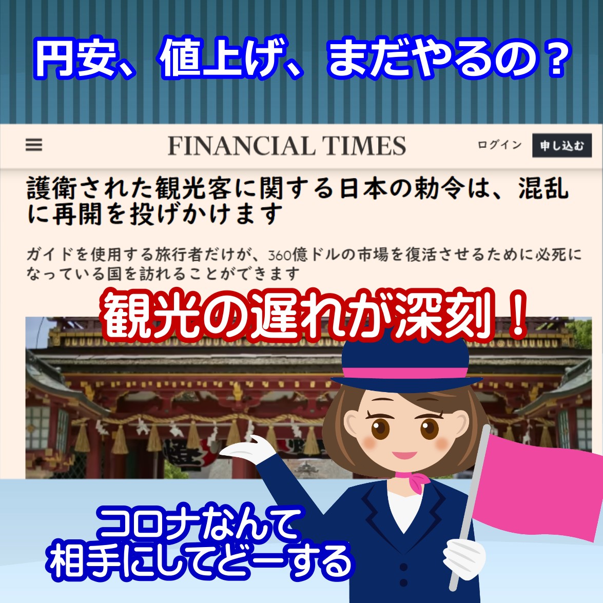 え?これだけ系座への負担も深刻なのに、まだコロナ??? もはや世界もビックリの遅れっぷりの日本。 それでもマスクしてワクチン打って、岸田政権は人気なんだよね。 観光業による収入の回復が見込めず、勝ちが暴落し深刻な円安。 ロシアへの経済制裁などで原材料、エネルギー不足で深刻な値上げ。 出てる結果がやったこと。 日本人の選択の結果は、これからハッキリしてくるでしょうね。「日本のお達しがツーリズム再開に対してカオスと混乱をもたらしている」 外国人観光客に課すおバカなガイドラインをフィナンシャルタイムズが記事にした。周回遅れの日本がバレたぞw