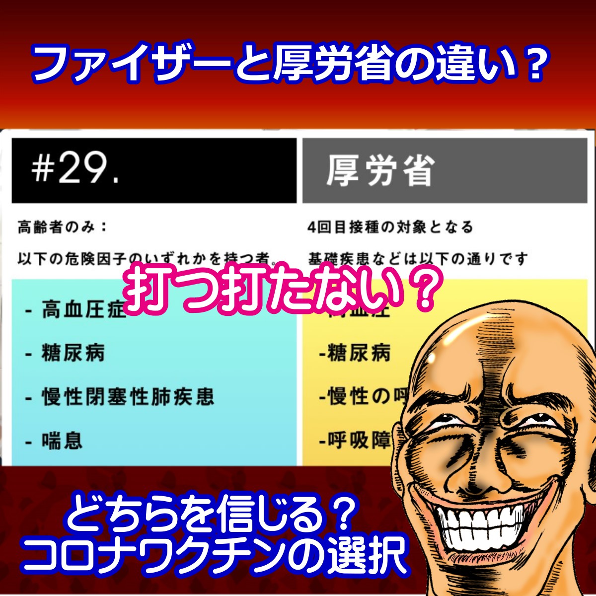 左:危険🚫 ファイザーが 高リスクのため治験から 外したグループ#29https://t.co/8Tk9xoHEC8 右:優先⭕️ 厚労省が4回目の 優先とした基礎疾患https://t.co/ZNFs2kM0DG pic.twitter.com/QdXmSPkldv — Laughing Man (@jhmdrei) May 8, 2022