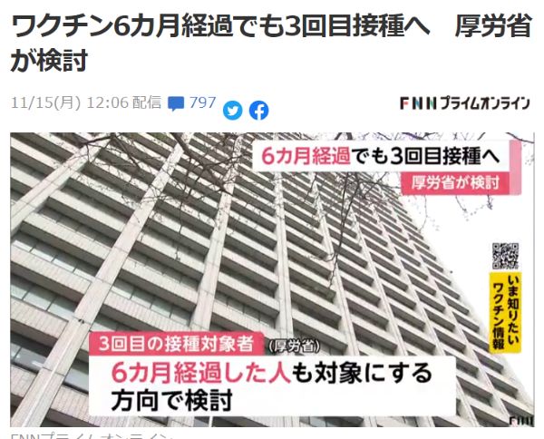 ワクチン6カ月経過でも3回目接種へ 厚労省が検討厚労省は職域接種していないそうです😥 pic.twitter.com/EuZbGvkz5X