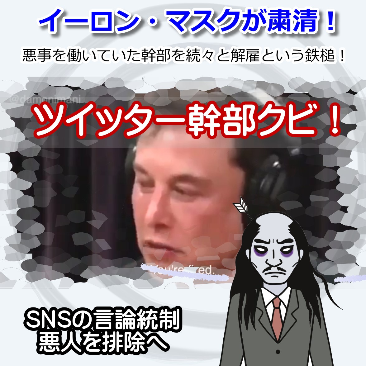 言論統制を行い、フェイクニュースを拡散。 事実を隠蔽し、悪事を働いてた幹部連中をすぐにクビ! トランプ大統領のアカウントも復活。 ツイッターからSNSは健全化するか? ただしYouTubeにWHOが管理したり、ペイパルがデマに罰金。※デマかどうかはペイパルが決める。 と、言論統制を進める勢力もあるってことですね。 あれ?ペイパルってイーロン・マスクが創業だったよね。 まぁこれから不正はどんどん暴かれていきそうです。イーロンマスクがTwitterの検閲部門の責任者を生中継でクビにした。 先ほど、イーロンマスクは従業員の解雇を開始するよう命じ、解雇リストを作成した。マスクは7,500人の従業員のうち75%を解雇すると約束している
