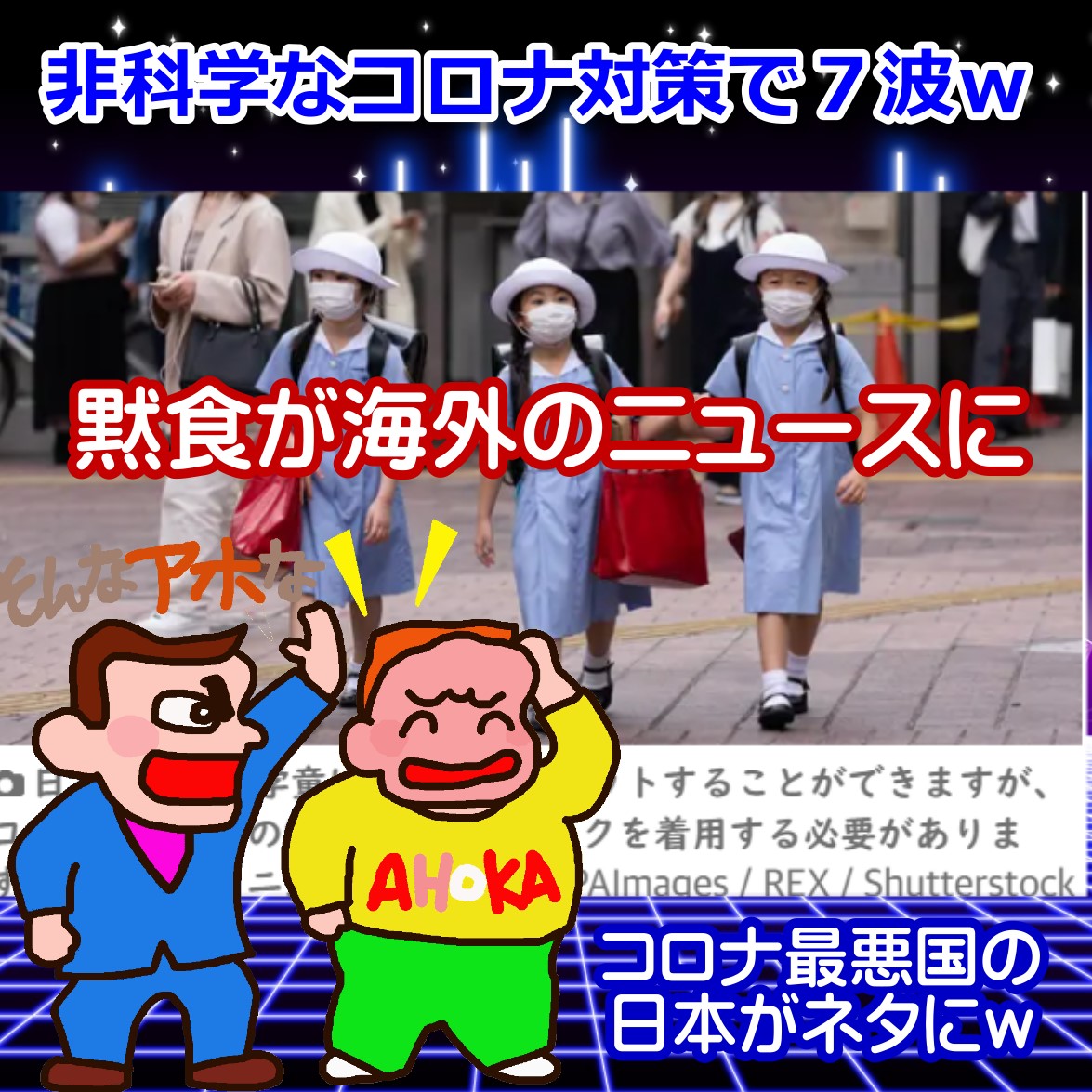 黙食が解除されたけど、まだ不安な親がいるってニュースにされておる。 いまだにコロナを続ける希少国の日本。 食事中の会話の許可がでても、反対する無能な親もいる。 コロナ対策の大失敗国の日本、いつまで続くのか。 空気感染も確認され、子どもにそもそもノーリスクなコロナウイルス。 マスク、消毒、アクリル板の無意味さも証明されても進歩できない日本。 そりゃ30年も賃金が上がるわけないわな。 犠牲になってる子どもにはもうしわけない。子供達は2年間も黙食を強いられてる一方、大人たちは居酒屋で毎晩楽しく会食している(英ガーディアン紙) 日本の異常な感染対策が世界に恥を晒す