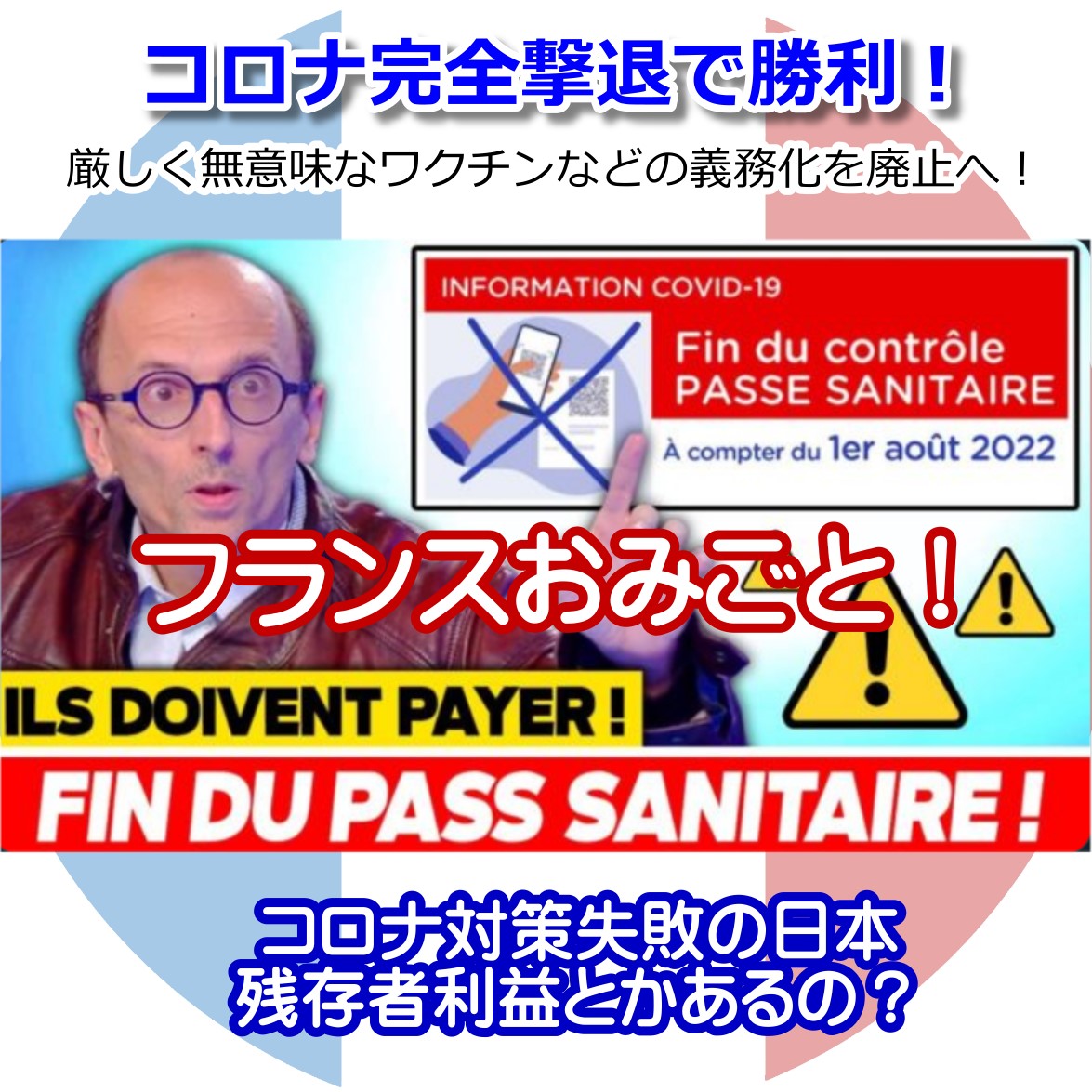 コロナ対策に効果があったから・・・ ならばワクチンもパスポートも継続するだろう。効果があるならね。 ロックダウンや外出禁止なども、感染症対策になれば続けるだろう。 まぁそういうこと。フランスばんざい!   あとはさざ波でコロナにノーリスクだったのに、感染爆発世界一の日本。 マスクにPCRにワクチンという悪手を選択肢、コロナ大国へ。 出てる結果がやったこと。 ノーワクチンでコロナ収束させた成功国がうらやましいですね。 うだうだ訳のわからない言い訳を続ける日本。 もう世界では終わってんだ。コロナなんてそんなもんなんだ。