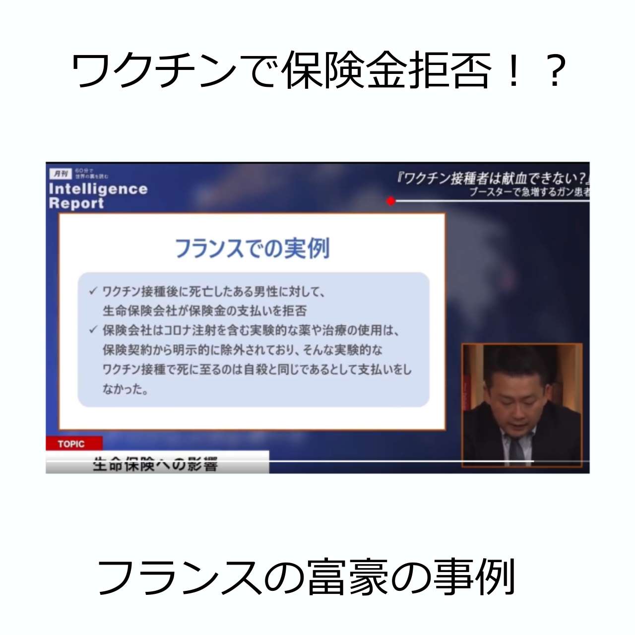 🇫🇷 フランスの生命保険会社は、ワクチンで死亡した場合、保険金の支払いを拒否している。 保険会社「ワクチンは実験段階であり、長期において、死亡するリスクがあり、それは、一般に認められていることでありながら、自らの意志で行うことは自殺行為に当てはまる。」😮