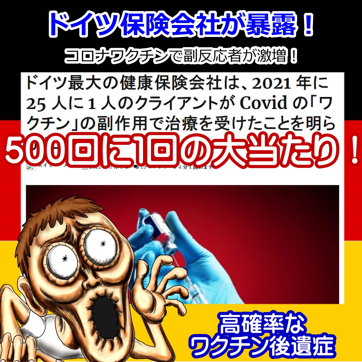 医療関係者や専門家は利権のために出た-改ざんに隠蔽を行うワクチンデータ。 ドイツの保険会社の発表では、25人に1人が要治療。 500回に1回の確立で深刻なワクチン後遺症の実態・・・ 保険の場合は支払いに関わってくるので、正確なデータが必要ですからね。 日本でもコロナ保険が終了したのも、PCR検査がインチキだからでしょうね。 どんどんmRNAコロナワクチンの効果が明らかになってきましたね。 オミクロン用?サル痘用?なんでも同じだよ。ドイツ最大の健康保険会社は、2021 年に 25 人に 1 人の顧客(1100万人の被保険者のうち43万7593人)が コロナワクチンの副反応のために治療を受けたことを明らかにした 「コロナのワクチン接種 500 回に 1 回が深刻な副作用を引き起こす可能性がある」