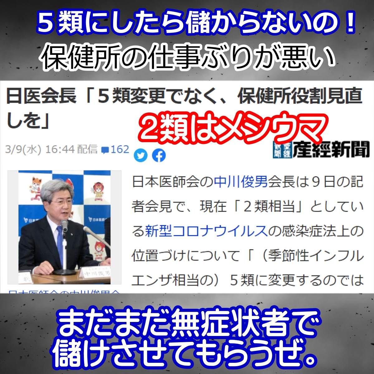 コロナを5類にしたら旨みがねーだろ。保健所の仕事ぶりが悪い。 日本医師会会長の言い分を要約するとこうだろうか。 濃厚接触者など、健康な人をおもしろルールで入院扱い。 医療ひっ迫も演出で補助金ボロ儲け。 補助金詐欺に関しては、補助金詐欺の歌いもでているだけに、厳しく精査する必要がありますね。医師会は補助金に群がる 詐欺師の集まりじゃん