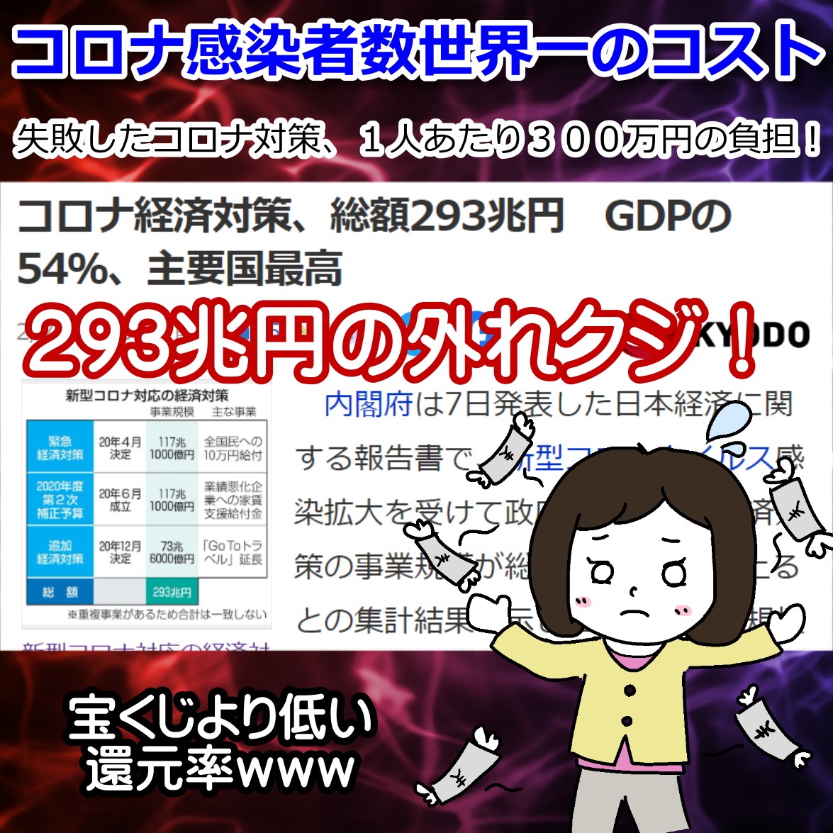300万円あったら、あなたは何をしますか? 世界最悪のコロナ対策、経済対策で使われた費用、293兆円。 だいたい国民1人あたり300万円だとか。 あなたが払ったお金、どれだけ戻ってきました? フェイクパンデミックに騙され怯えているうちに、金を盗られるただの詐欺w コロナは茶番と気付いていた人は、とばっちりと言えるでしょう。 マスクや消毒にコロナワクチンで、人生の質を奪われた人もいるわけですから。 今回の特殊詐欺をきっかけにして、今後は政府や専門家にだまされないようにしましょう。日本が費やしたコロナ経済対策の総額は日米欧の主要国で最高の293兆円。マスク着用率・ワクチン接種率も世界トップ。店や施設では検温・消毒・アクリル板などの対策を徹底。 専門家の意見を聞き入れ完璧なまでに対策をした日本。その結果が新型コロナの感染者数が10週連続で世界最多となりました。